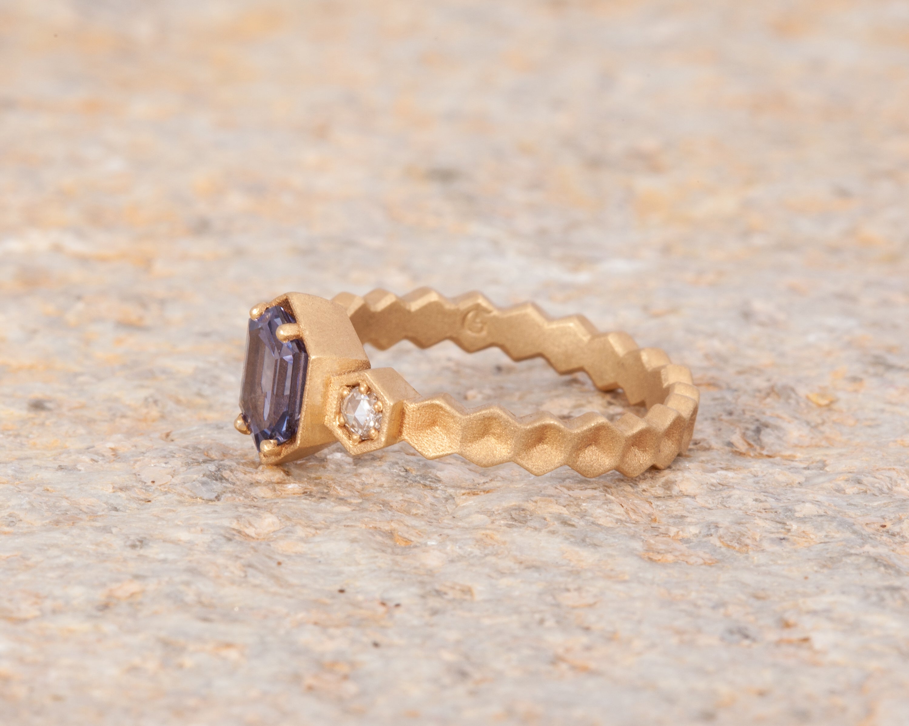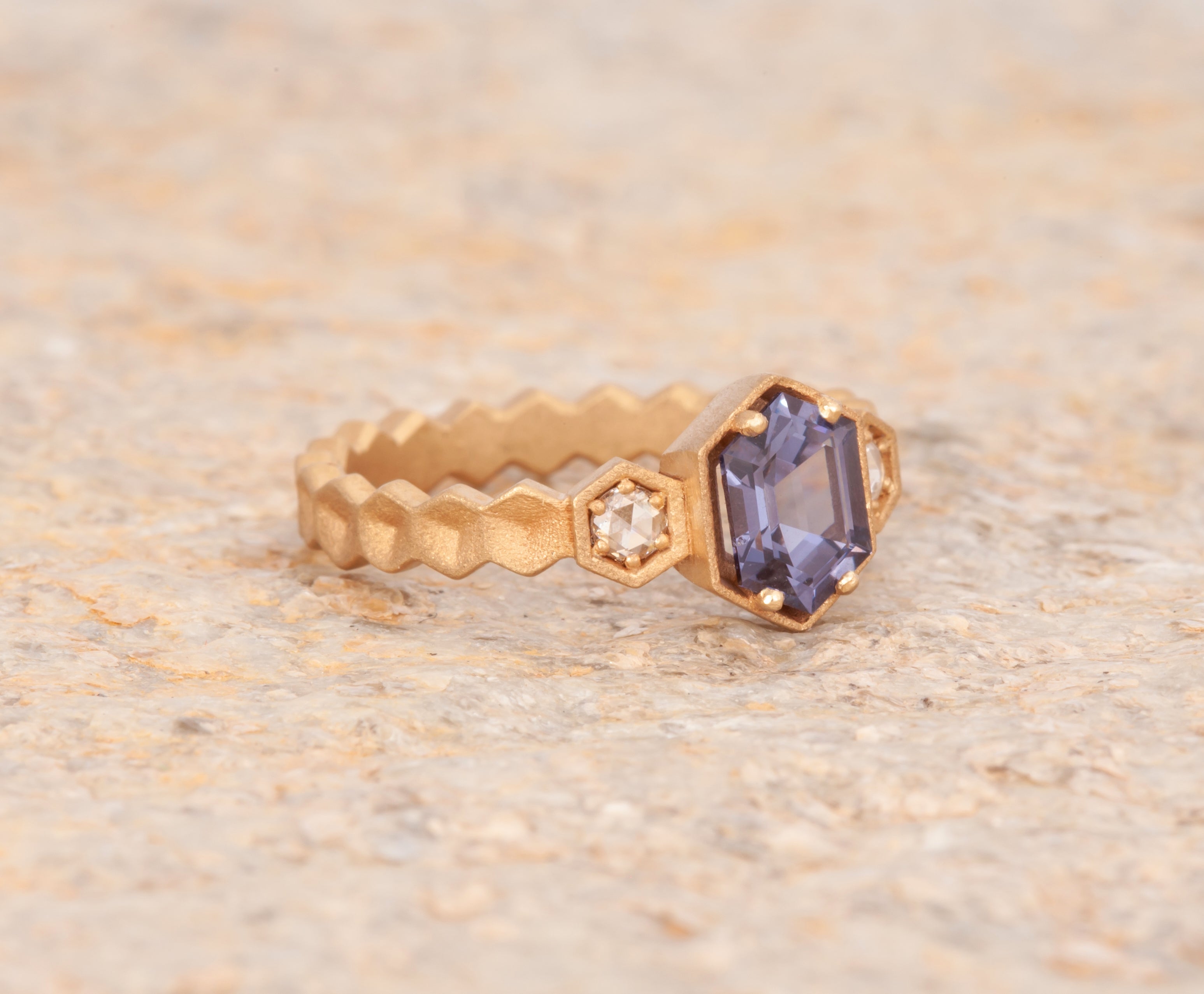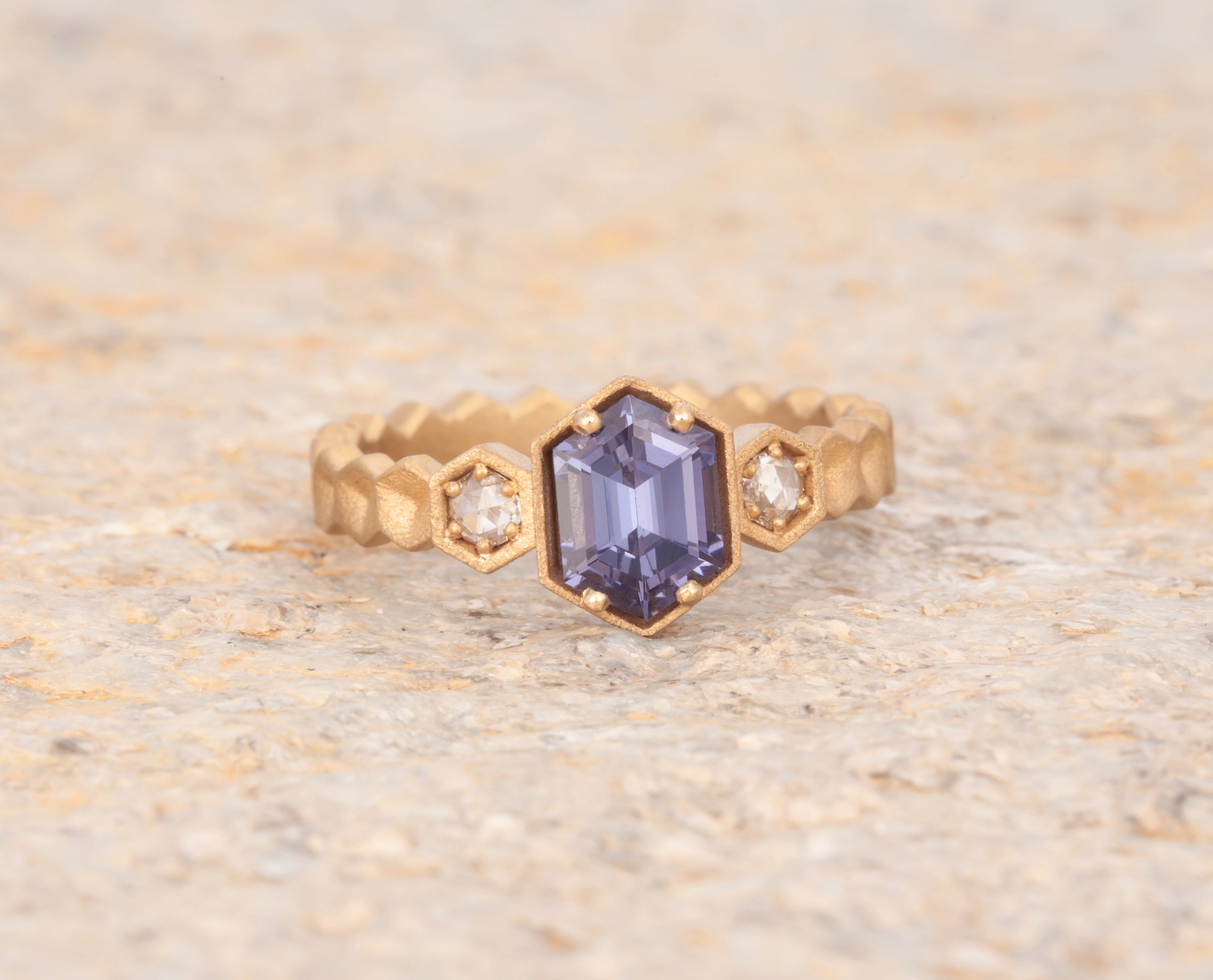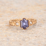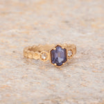 Size 6.25 14k Yellow Gold with 1.11ct Purple Spinel with a sandblasted texture. The step cut hexagon spinel is accented with 2 round rosecut diamonds. This ring is not easily sizable, but this design may be custom ordered in our settings.