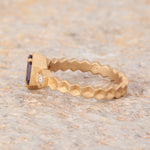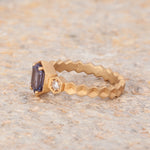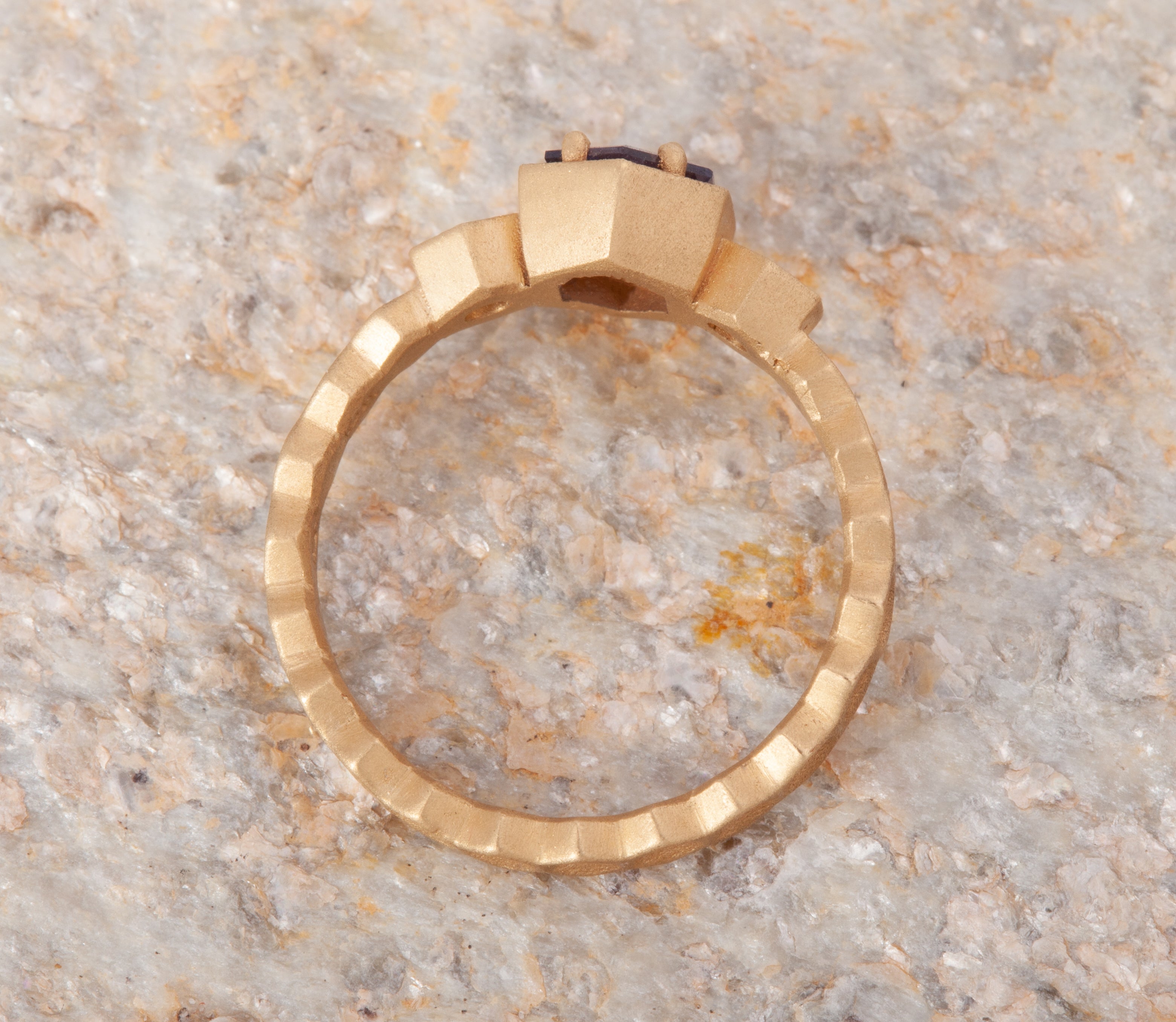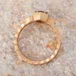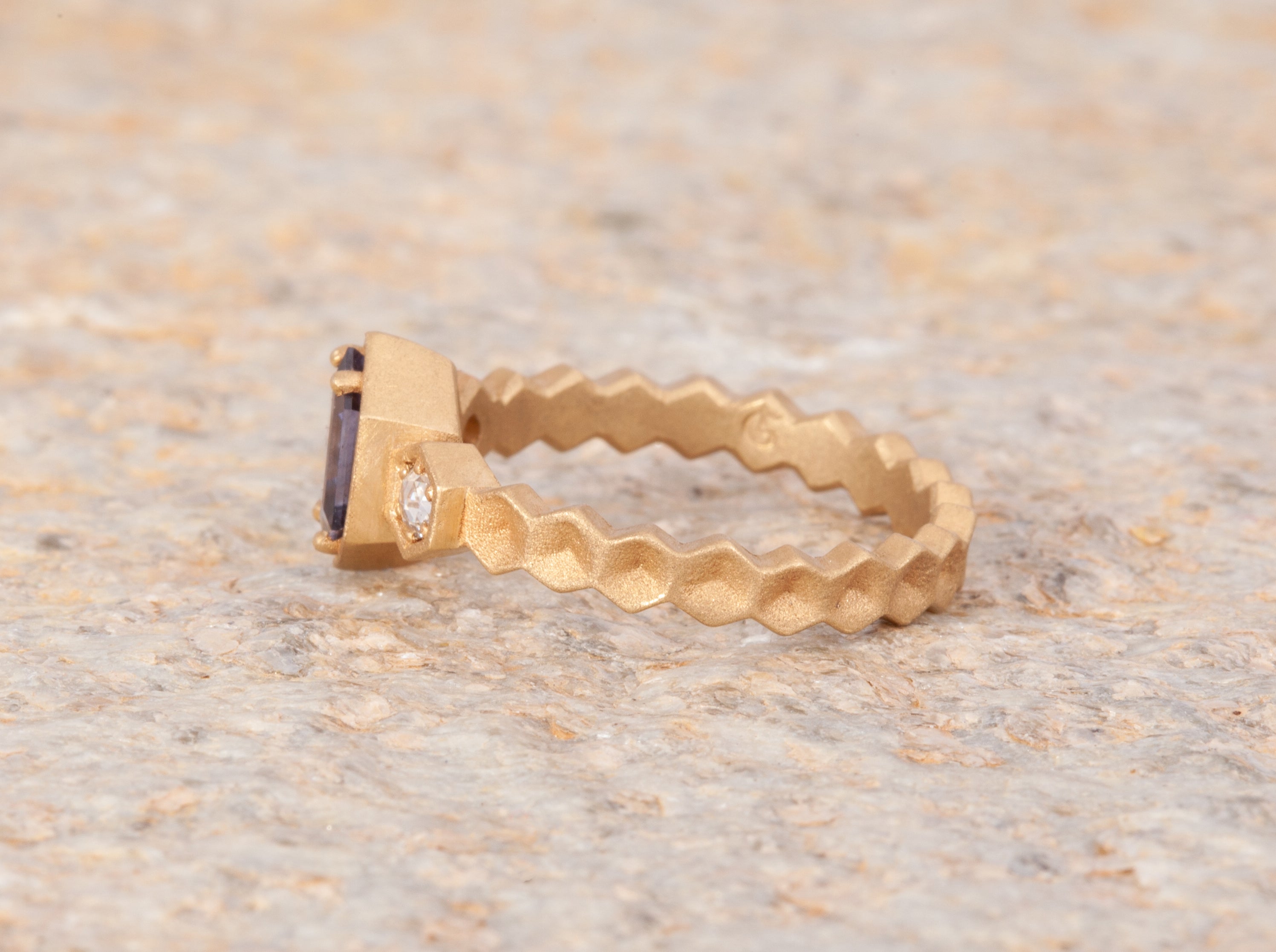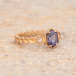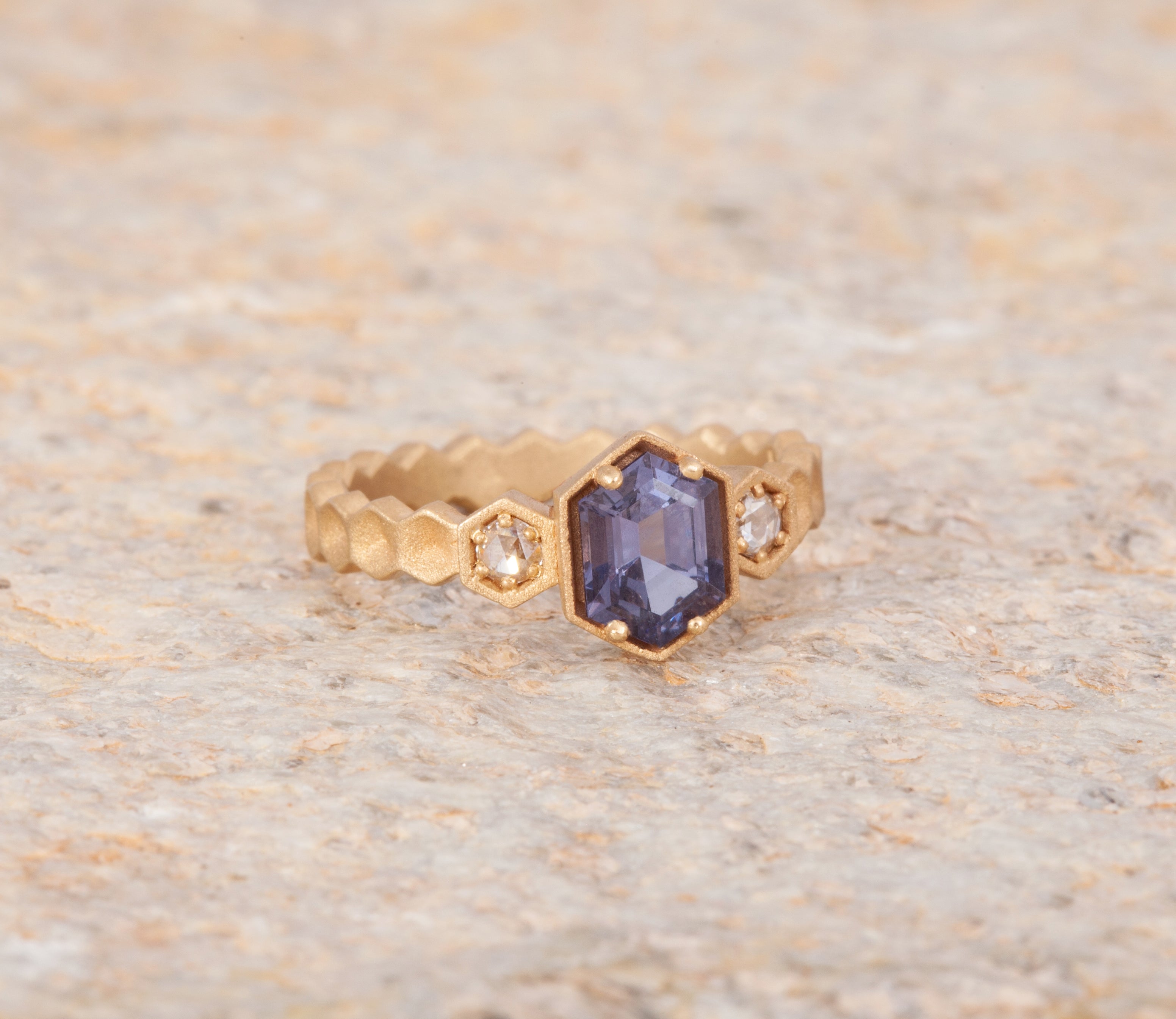 Size 6.25 14k Yellow Gold with 1.11ct Purple Spinel with a sandblasted texture. The step cut hexagon spinel is accented with 2 round rosecut diamonds. This ring is not easily sizable, but this design may be custom ordered in our settings.